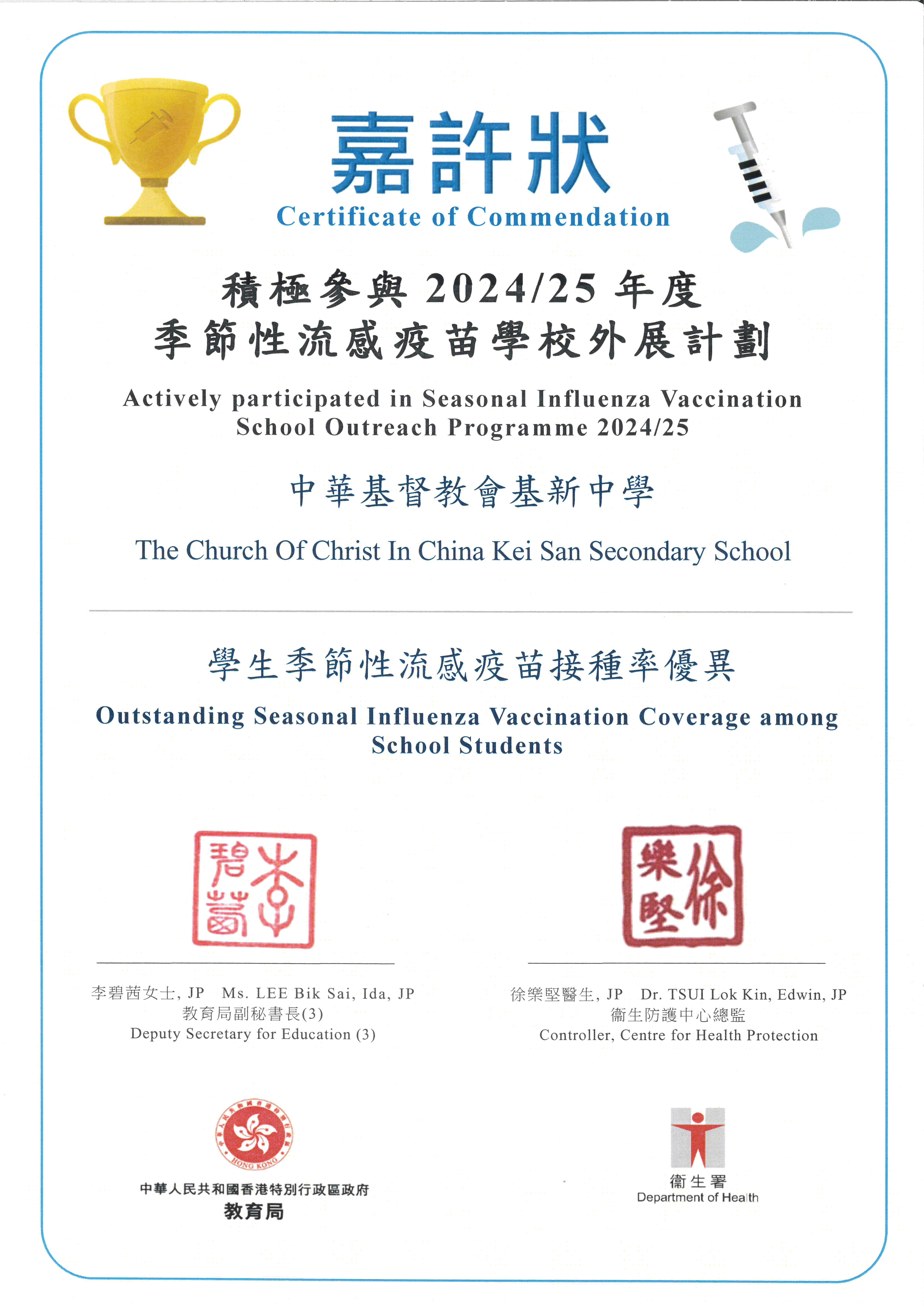 2025-08-31 | 本校積極參與2024/25年度季節性流感疫苖學校外展計劃,獲頒嘉許狀。 | ![]() |